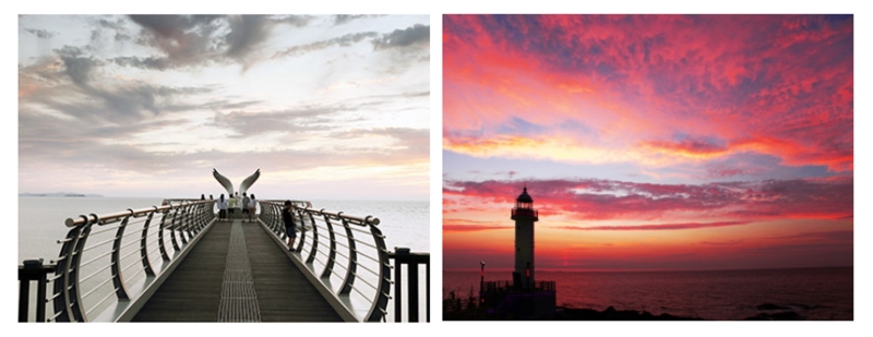 ▲ 백수해안도로 노을전망대(왼쪽)와 낙조 백수해안도로에서 바라본 낙조 [전남 영광군]