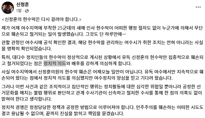 이번 현수막 훼손 사건과 관련해 신 의원은 자신의 SNS에 "유독 신정훈의 현수막만 집중적으로 훼손되고 철거됐다는 점은 정치적 의도와 배후를 강하게 의심하게 한다"며 "민주주의를 훼손하는 어떤 시도도 결코 용납될 수 없다"고 강조하기도 했습니다.