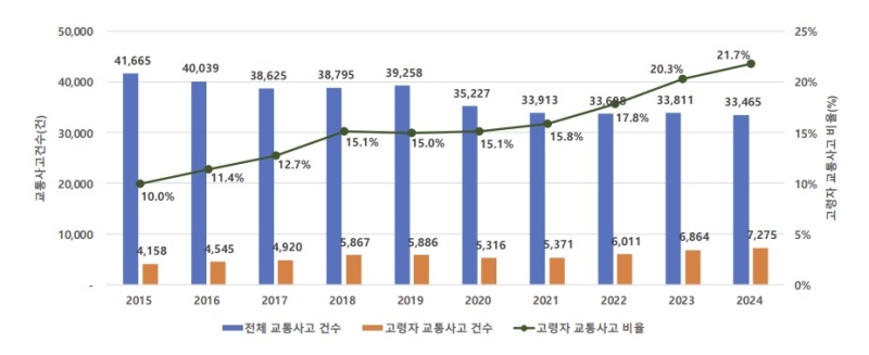 고령 운전면허 소지자 수 역시 2015년 49만 명에서 2024년 95만 명으로 두 배 가까이 증가했습니다.