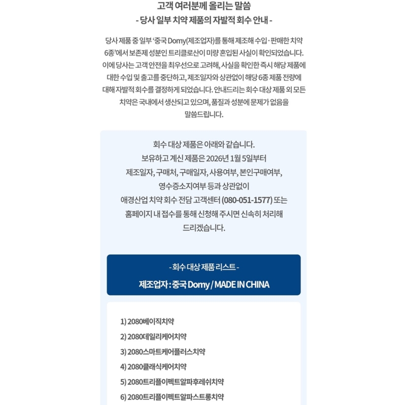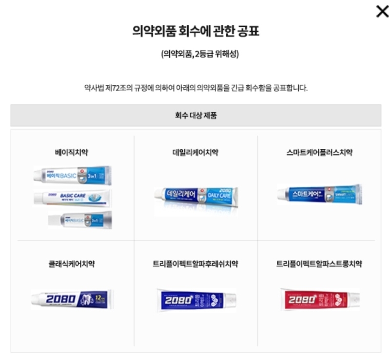 해당 제품은 △2080 베이직치약 △2080 데일리케어치약 △2080 스마트케어플러스치약 △2080 클래식케어치약 △2080 트리플이펙트알파후레쉬치약 △2080 트리플이펙트알파스트롱치약 등입니다.