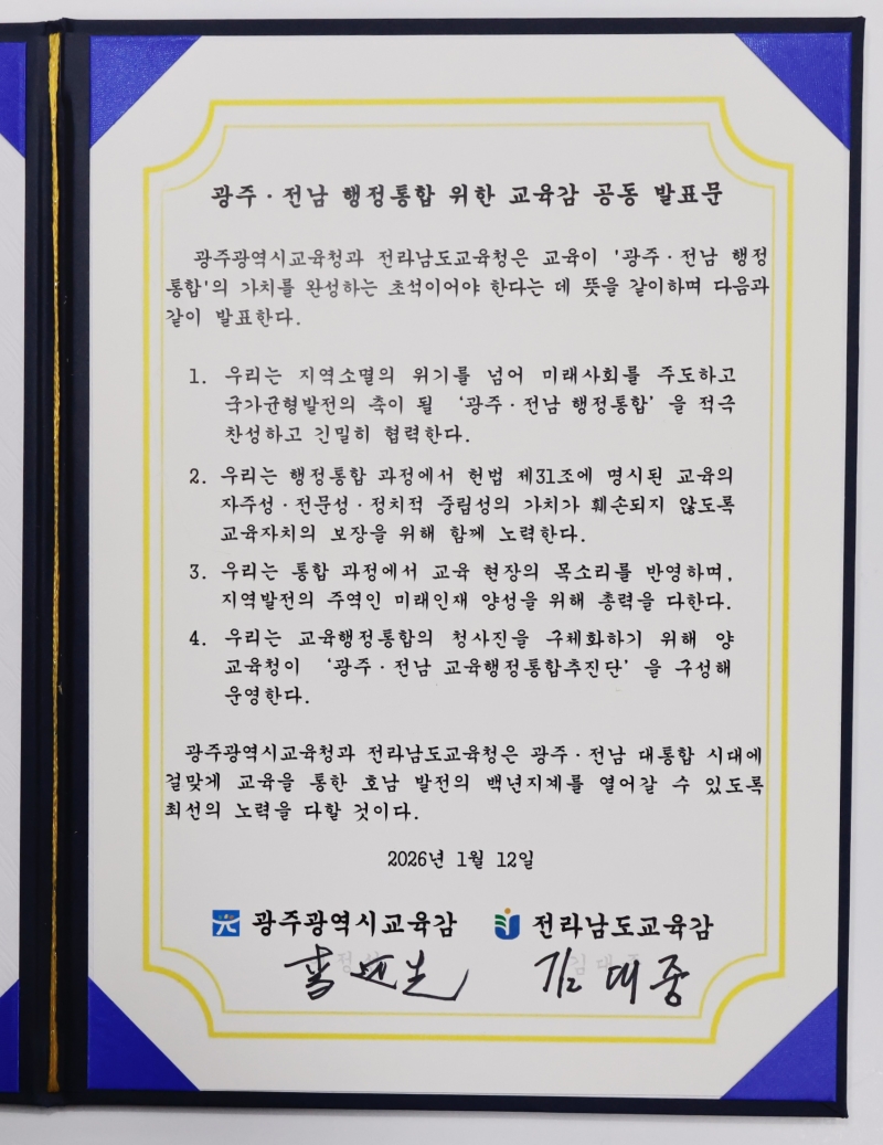 광주와 전남 교육청은 발표문에서 "지역 소멸의 위기를 넘어 미래 사회를 주도하고 국가 균형 발전의 축이 될 '광주·전남 행정통합'을 적극 찬성하고 긴밀히 협력한다"고 밝혔습니다.