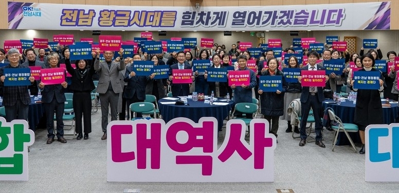 전남사회복지사협회와 광주사회복지사협회는 26일 전남도청 왕인실에서 '행정통합 지지 사회복지인 공동선언' 행사를 열고, 광주·전남 행정통합이 시·도민의 삶의 질 향상과 복지서비스의 균형적 제공으로 이어지도록 적극 협력하겠다는 뜻을 모았습니다.