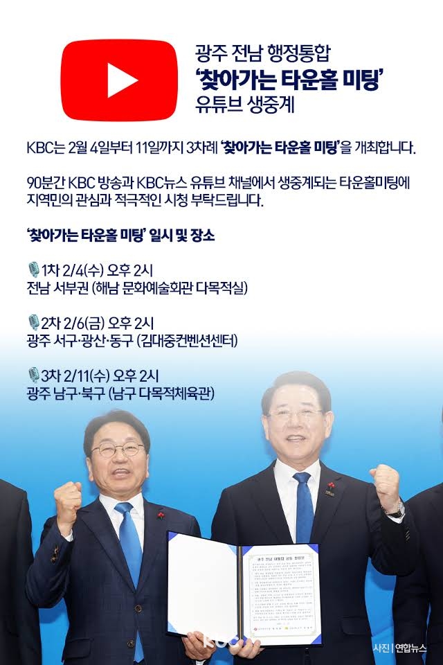 KBC광주방송은 2월 4일(수)과, 6일(금), 11일(수) 세 차례에 걸쳐 <광주·전남 행정통합, 찾아가는 타운홀 미팅>을 개최합니다.