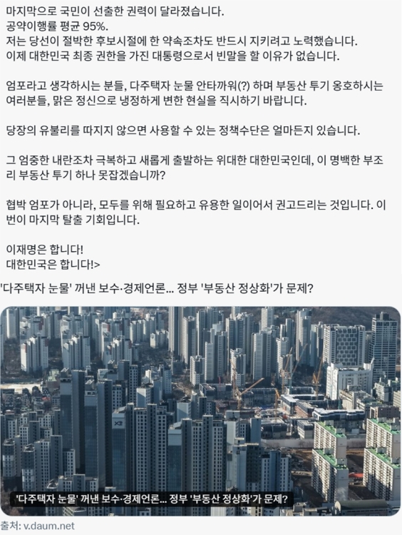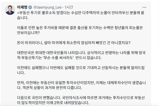 해당 글에서 이 대통령은 '다주택자 눈물 꺼낸 보수·경제언론…정부 부동산 정상화가 문제?'라는 제목의 기사를 링크한 뒤 "불로소득을 얻겠다는 다주택자의 눈물이 안타까운 분들께 묻는다. 높은 주거비용으로 결혼·출산을 포기하는 수백만 청년의 피눈물은 안 보이나"라고 지적했습니다.
