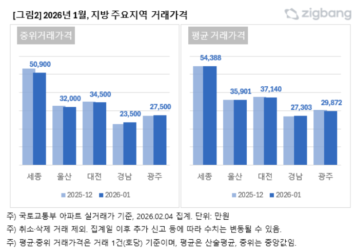 반면 세종시의 아파트 중위가는 지난해 12월 5억 3,300만 원에서 지난달 5억 900만 원으로, 평균가는 같은 기간 5억 4,575만 원에서 5억 4,388만 원으로 하락했습니다.