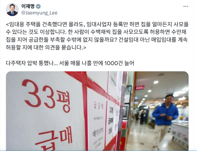 이 대통령은 9일 오후 엑스(X, 구 트위터)에 "서울 시내 등록 임대주택 약 30만 호(아파트 약 5만 호)는 취득세, 재산세, 종부세 감면과 영구적 다주택 양도세 중과 제외라는 특혜를 받는다"고 밝혔습니다.
