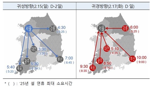 주요 도시 간 최대 소요 시간은 귀성의 경우 15일(서울→부산 7시간), 귀경은 17일(부산→서울 10시간)로 예측됐습니다. 예상 교통비용은 약 24만 5천 원으로 작년보다 3천 원가량 줄어들 것으로 나타났습니다.
