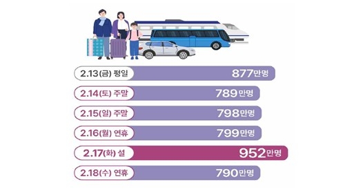 한국교통연구원 조사 결과, 이번 대책 기간 귀성·귀경 및 여행 등으로 이동하는 인원은 총 2,780만 명에 달할 것으로 보입니다. 전체 이동 인원은 지난해 설보다 13.3% 감소했으나, 연휴 기간이 짧아짐에 따라 일평균 이동 인원은 834만 명으로 오히려 9.3% 늘어날 것으로 분석됐습니다. 특히 설 당일인 17일에 가장 많은 952만 명이 이동할 전망입니다.