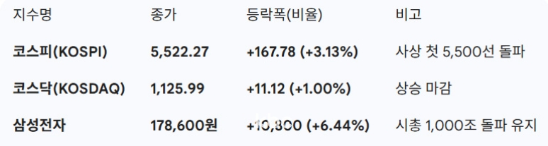 이날 코스피는 전장보다 167.78포인트(3.13%) 오른 5,522.27로 장을 마치며 종가 기준 역대 최고치를 경신했습니다.