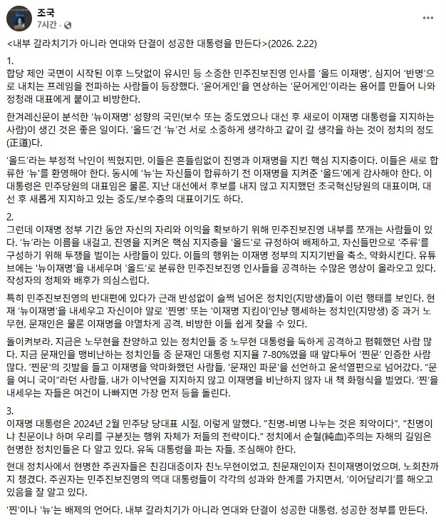 그러면서 "이들의 행위는 이재명 정부의 지지기반을 축소, 약화한다"며 "민주진보진영의 반대편에 있다가 근래 반성 없이 슬쩍 넘어온 정치인(지망생)들이 이런 행태를 보인다"고 지적했습니다.