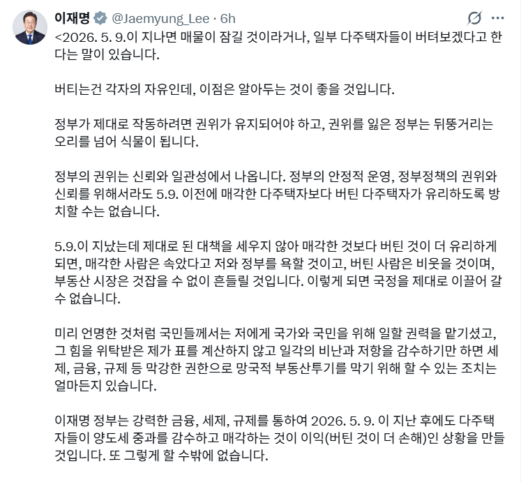 이 대통령은 "잠긴 매물은 질식할 것이고 버티는 일은 더 큰 부담이 될 것"이라며 "정부 정책에 역행하고 규칙을 어긴 이가 이익을 얻지 못하도록 하는 것이 대한민국 정상화의 핵심"이라고 덧붙였습니다.