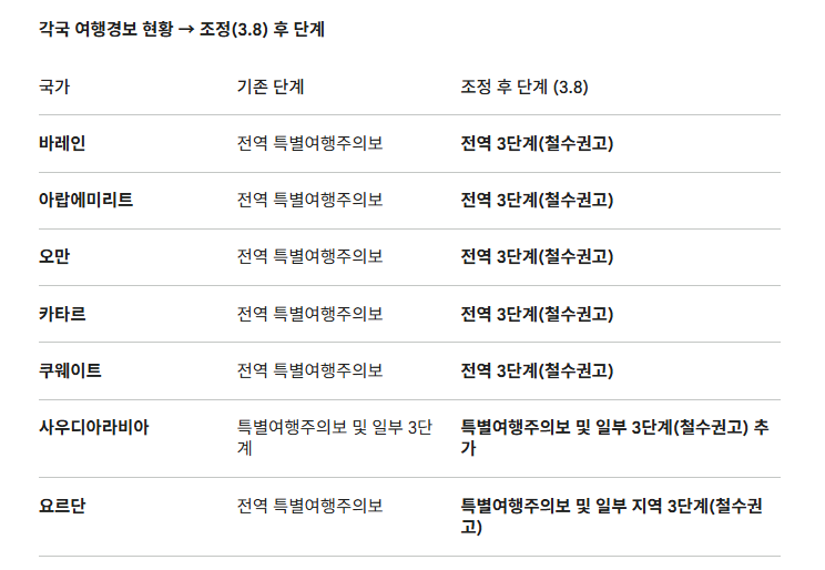 바레인, 아랍에미리트, 오만, 카타르, 쿠웨이트는 전역이 3단계 대상 지역으로 조정됐습니다.