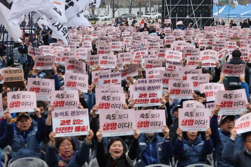참석자들은 집회를 마친 뒤 광화문 동십자각에서 종각영 방면으로 '속도보다 생명이다'란 문구가 적힌 택배 박스를 들고 행진을 시작했습니다.