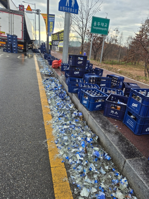 이 사고로 인명피해는 없었지만, 도로에 맥주병이 깨지면서 일대 교통 정체가 이어졌습니다.