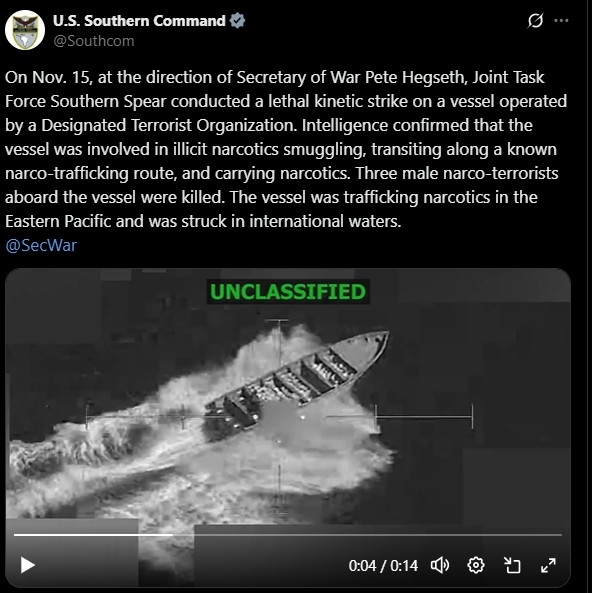 미 남부사령부(SOUTHCOM)는 16일(현지시간) 엑스(X·옛 트위터) 계정에 "피트 헤그세스 전쟁부(국방부) 장관의 지시에 따라 11월 15일 합동 태스크포스 '서던 스피어'(Southern Spear)는 지정 테러 조직(DTO)이 운영하는 선박에 대해 치명적인 물리적 공격을 수행했다"고 밝혔습니다.