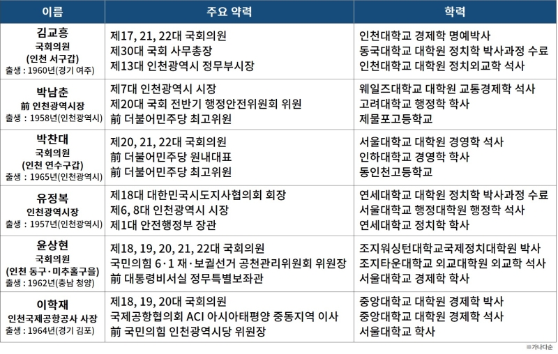 3선 의원 출신으로 인천 서구 쪽 기반이 탄탄하며 공항공사 사장 임기가 2026년 5월 종료되는 점과 맞물려 강력한 대항마로 꼽힙니다.
